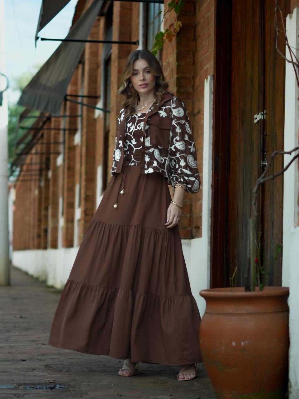 Vestido Trama da Terra longo com corpo bordado, alças médias e detalhe em lastex nas costas para ajuste perfeito. A saia com babados maria e o cinto delicado completam esse visual marcante e feminino.
