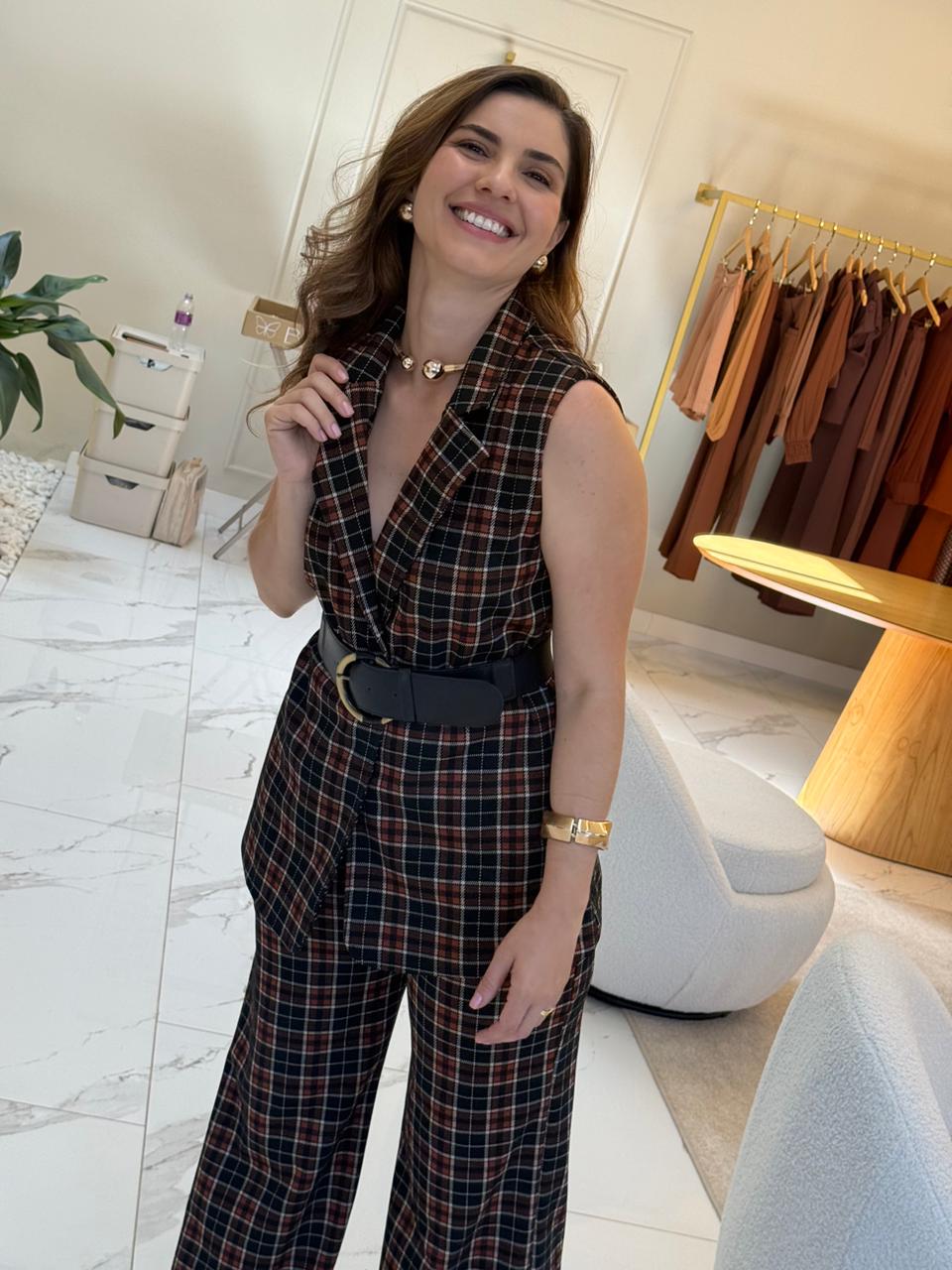 O colete alfaiataria tartan faz parte da coleção exclusiva Collab Sheila Pilon + Mango Tango Brasil, trazendo a elegância da alfaiataria com um toque contemporâneo e cheio de personalidade.