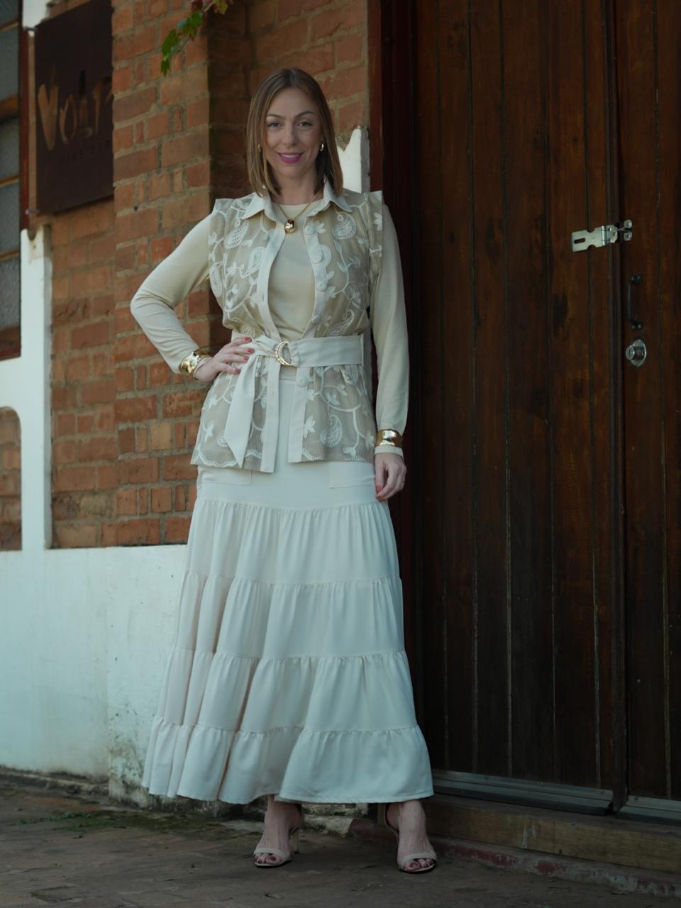 Saia Trama da Terra , a saia possui cós alto bordado, bolsos faca e fechamento lateral. Os babados em camadas maria trazem movimento e leveza, realçando o charme artesanal da peça.
